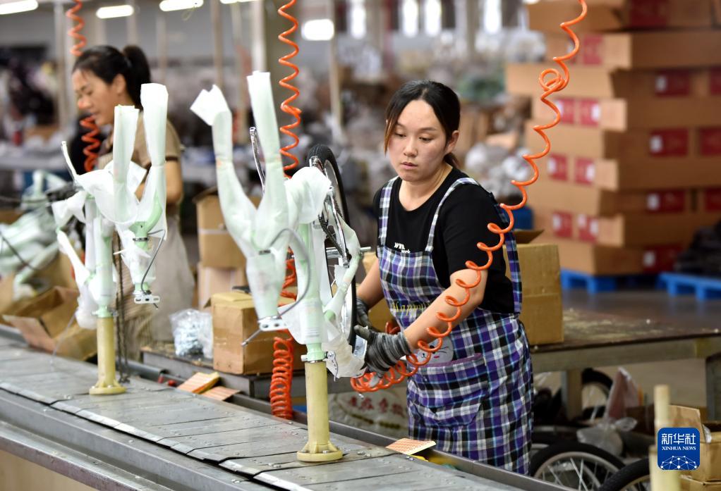 9月18日,河北省威縣一家童車生產企業工人在生產車間組裝童車。