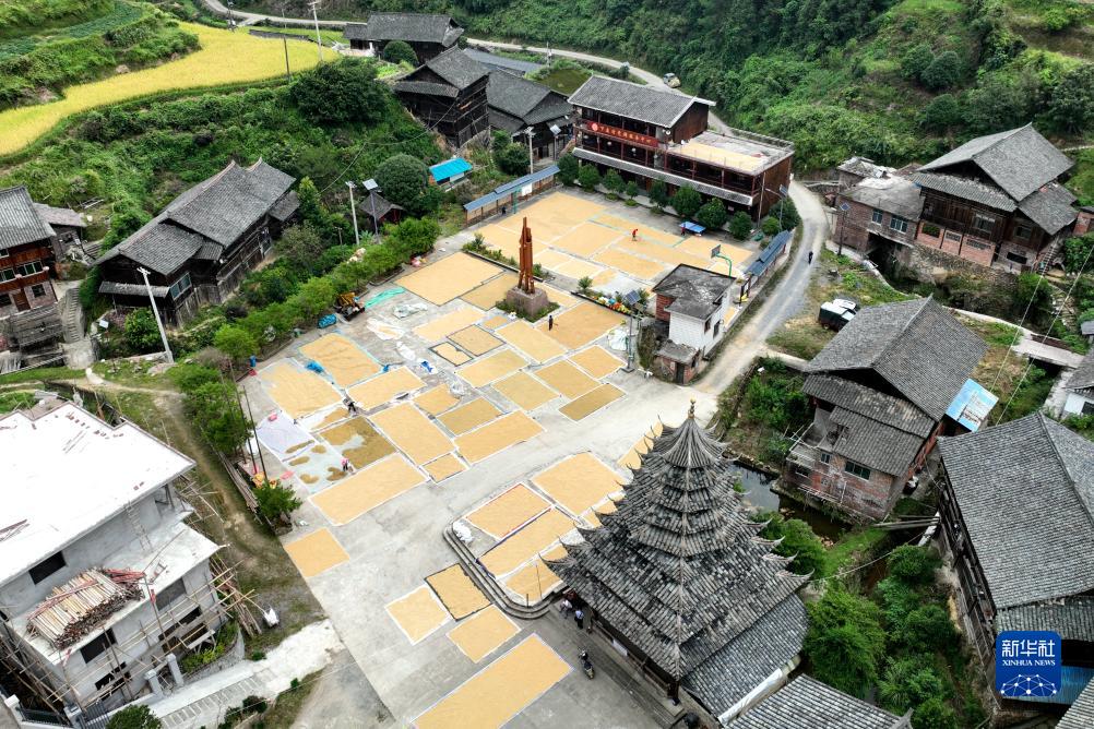 9月18日,在湖南省懷化市通道縣坪坦鄉下盤古侗寨,村民在鼓樓邊晾曬稻谷(無人機照片)。
