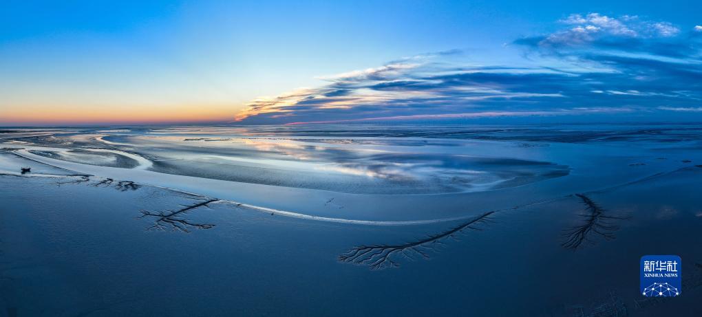 這是鹽城東臺條子泥濕地日出時分景色(2023年9月1日攝,無人機照片)。
