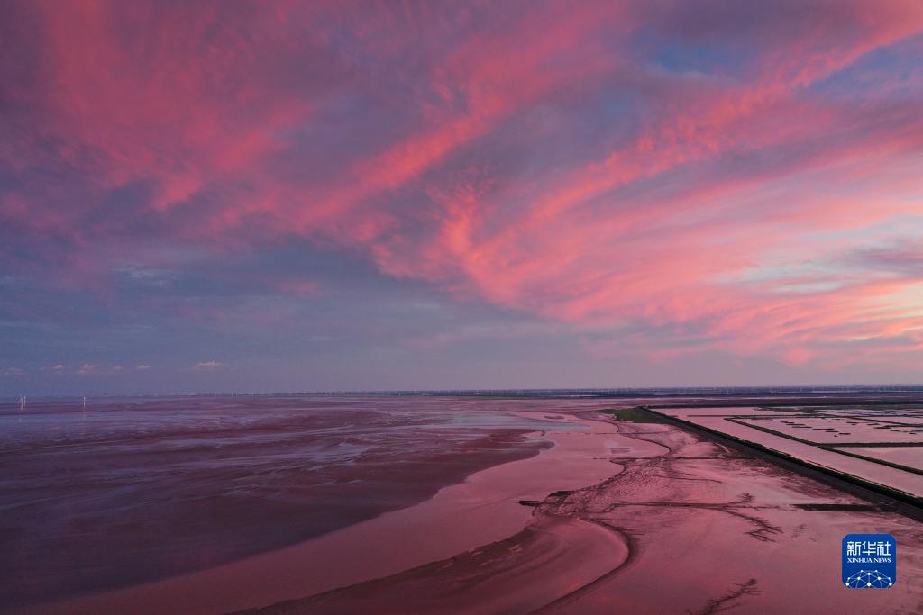 夕陽下的鹽城東臺條子泥濕地(2023年8月31日攝,無人機照片)。