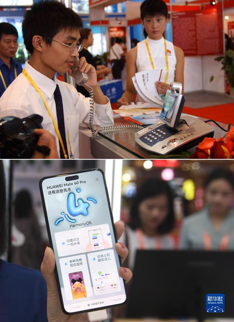 拼版照片:上圖為2005年10月19日,在第2屆中國—東盟博覽會上,一名參展商在展示一款電話機(新華社記者劉廣銘攝);下圖為2023年9月18日,在第20屆中國—東盟博覽會上,一名參展工作人員在展示一款手機(新華社記者陸波岸攝)。