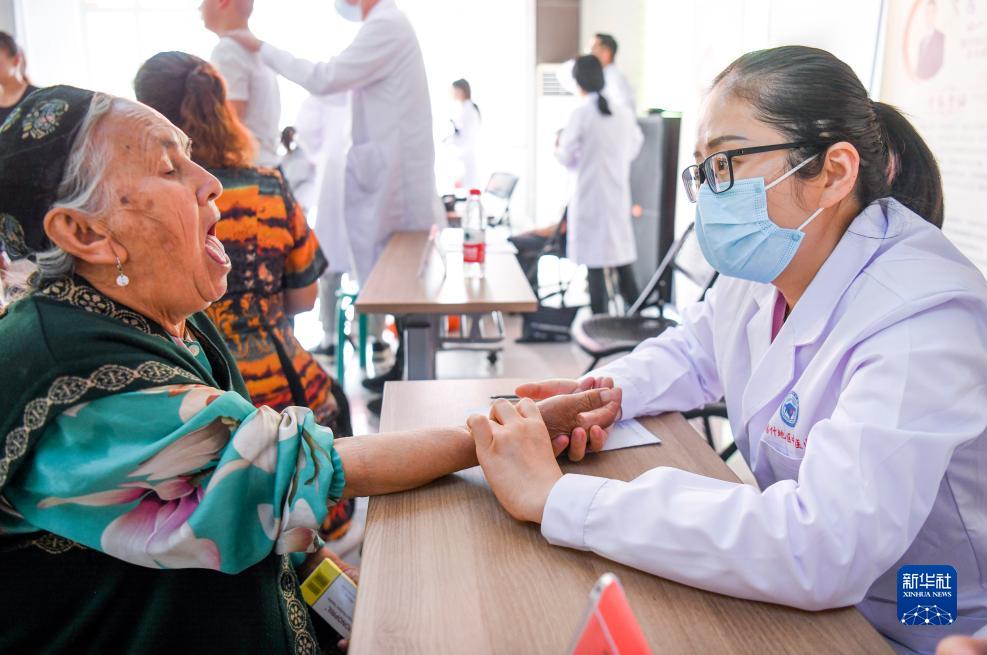 在新疆喀什市夏馬勒巴格鎮團結小區,來自山東中醫藥大學第二附屬醫院的援疆醫生李榮華(右)在面向社區居民的義診活動中進行義診(9月16日攝)。