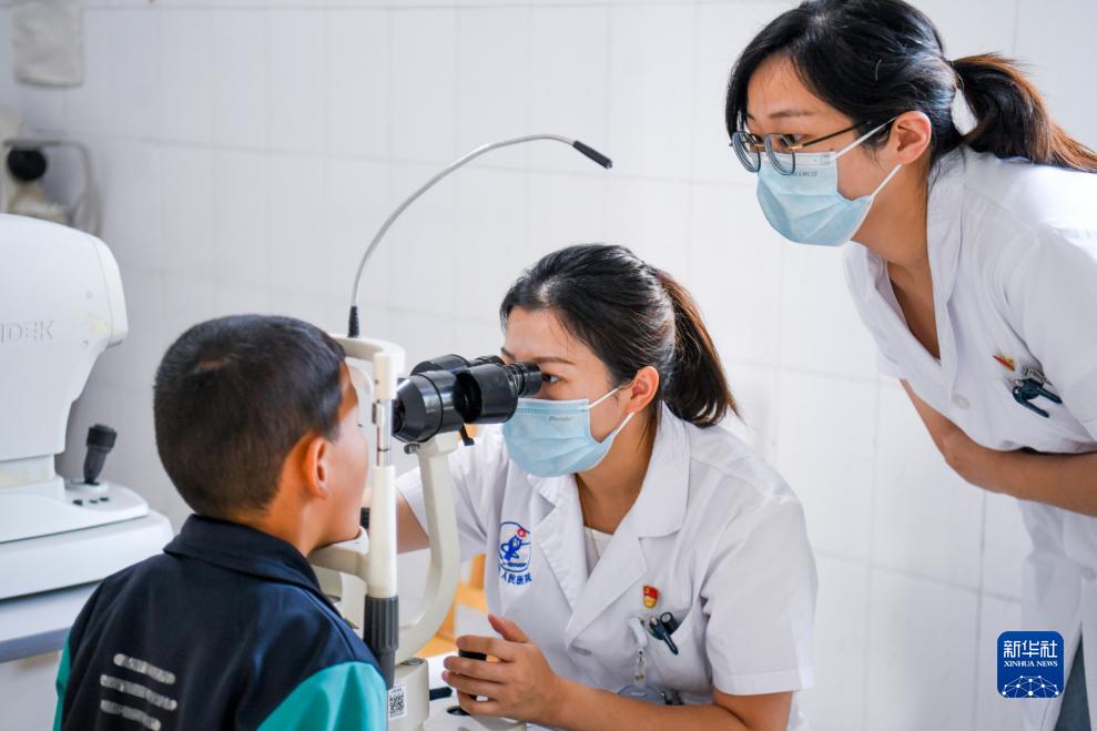 在新疆喀什地區英吉沙縣人民醫院眼科檢查室內,眼科主任劉媛媛(中)和來自山東省濟寧市第三人民醫院的援疆醫生石文芳(右)為小患者進行檢查(9月15日攝)。
