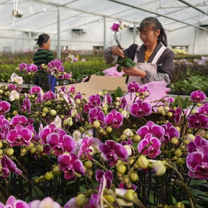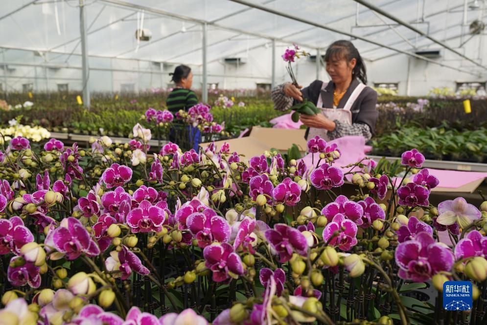 9月18日,農戶在大棚內挑選蝴蝶蘭。