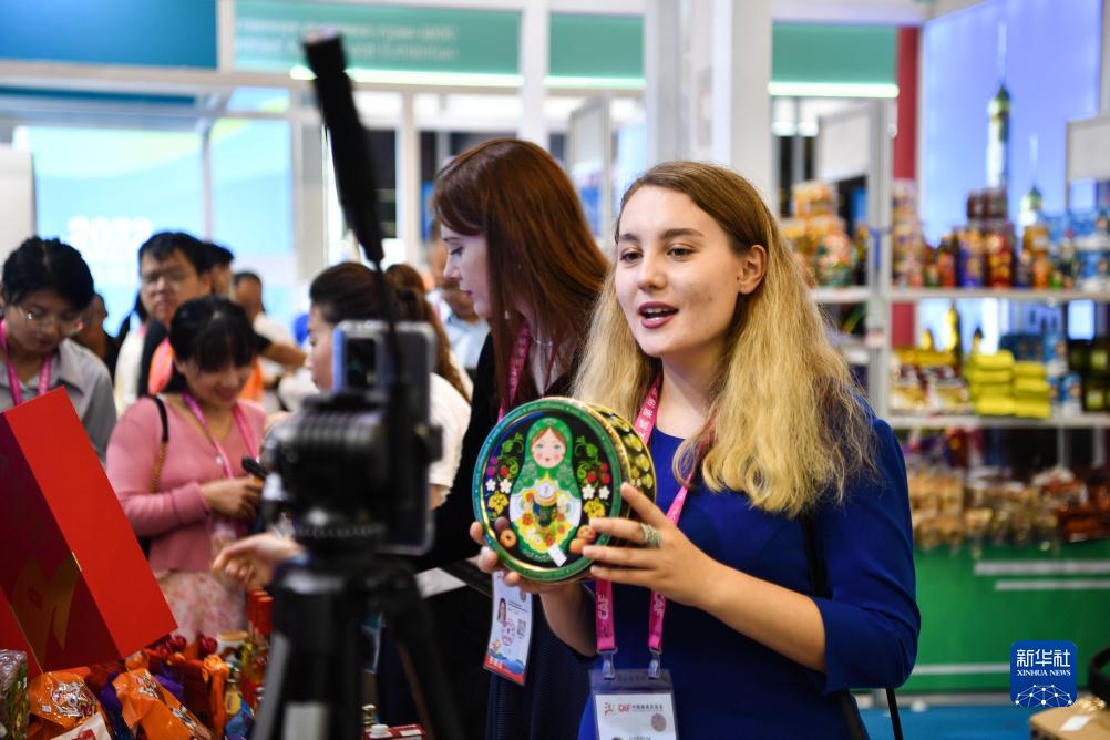 9月19日,來自俄羅斯的參展商在楊凌農高會展臺進行直播。