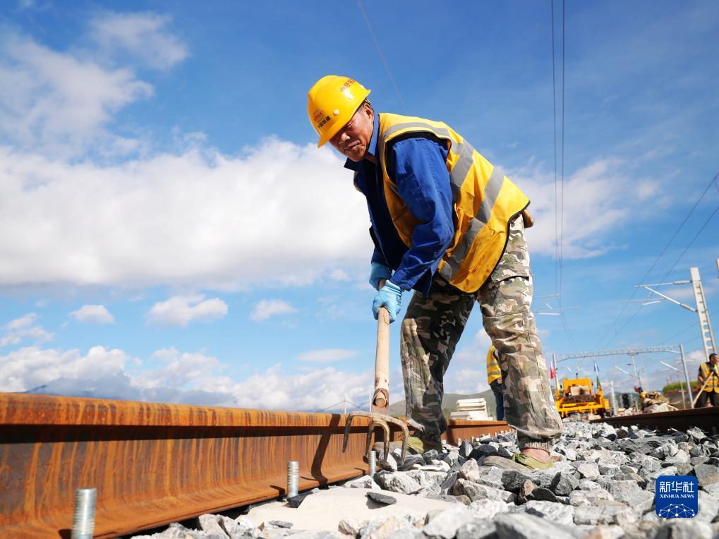 9月18日,施工人員在滇藏鐵路麗香段香格里拉站清理道床。