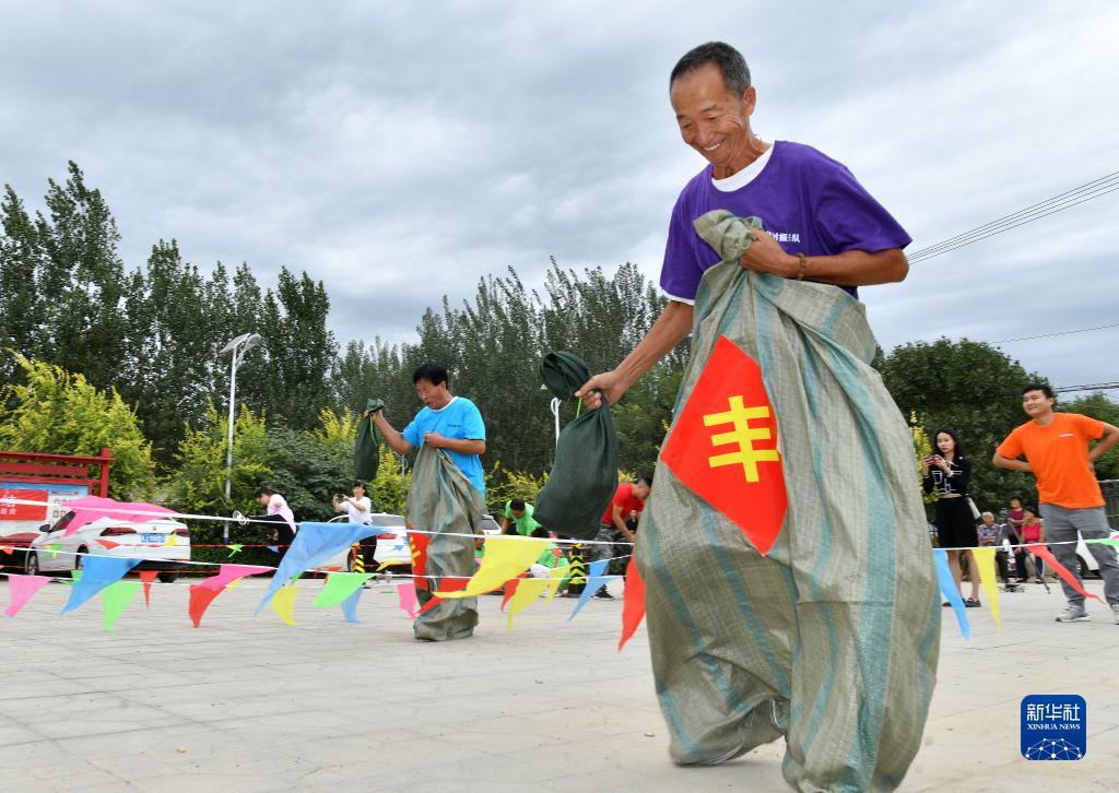9月19日,農民在肅寧縣師素鎮農民趣味運動會上進行袋鼠跳比賽。
