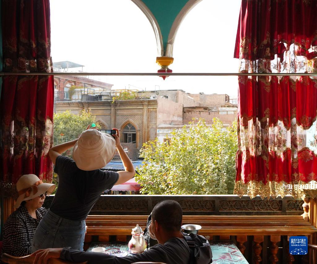 游客在新疆喀什古城百年老茶館內喝茶(9月7日攝)。