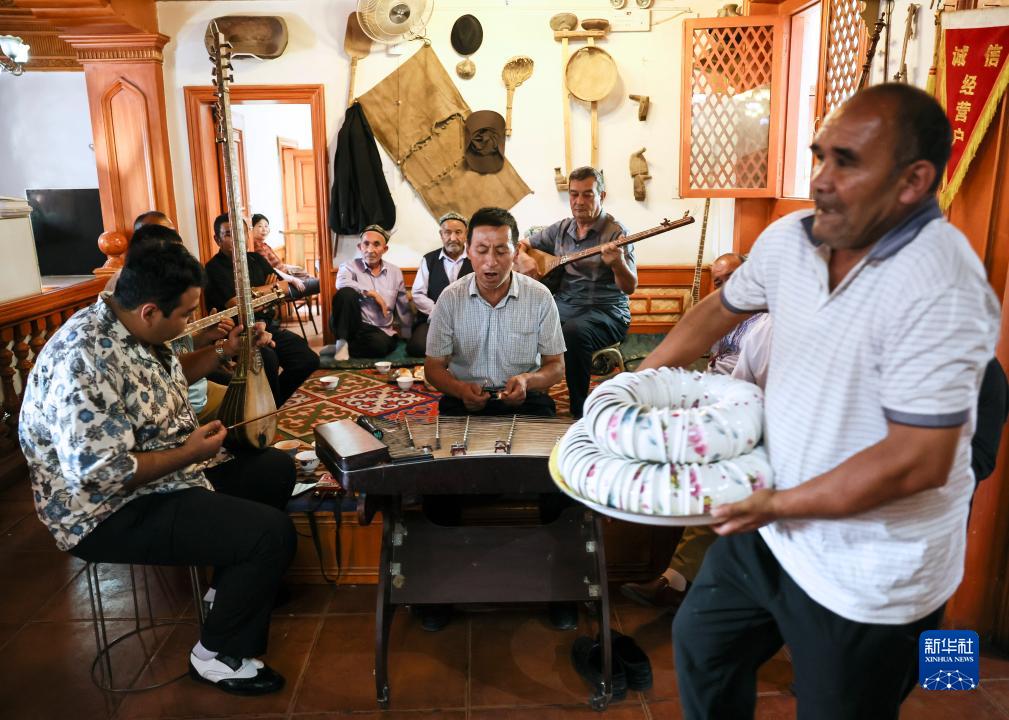 樂手在新疆喀什古城百年老茶館內彈唱(9月7日攝)。