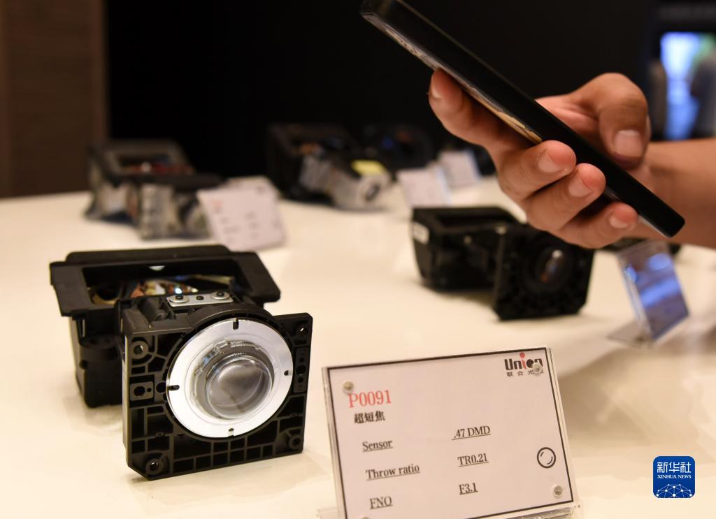 9月19日,一名參會者在拍攝激光電視使用的超短焦鏡頭。