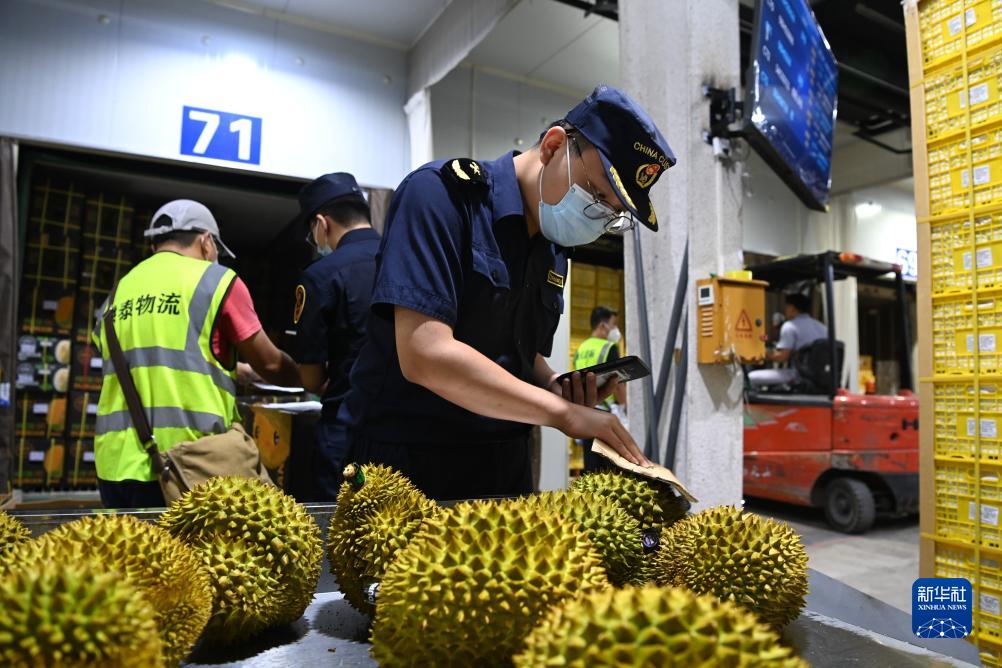 9月12日,在廣西憑祥友誼關口岸,海關工作人員對進口的榴蓮進行查驗。