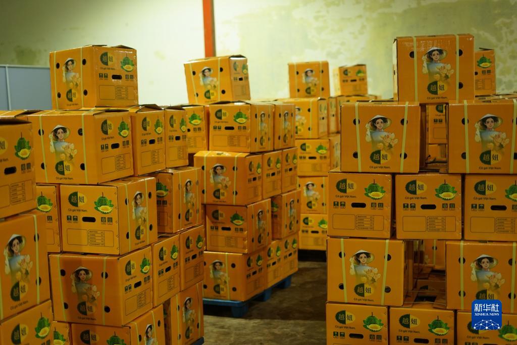 9月15日,在越南多樂省一家榴蓮加工廠,包裝好的榴蓮在等待裝車。