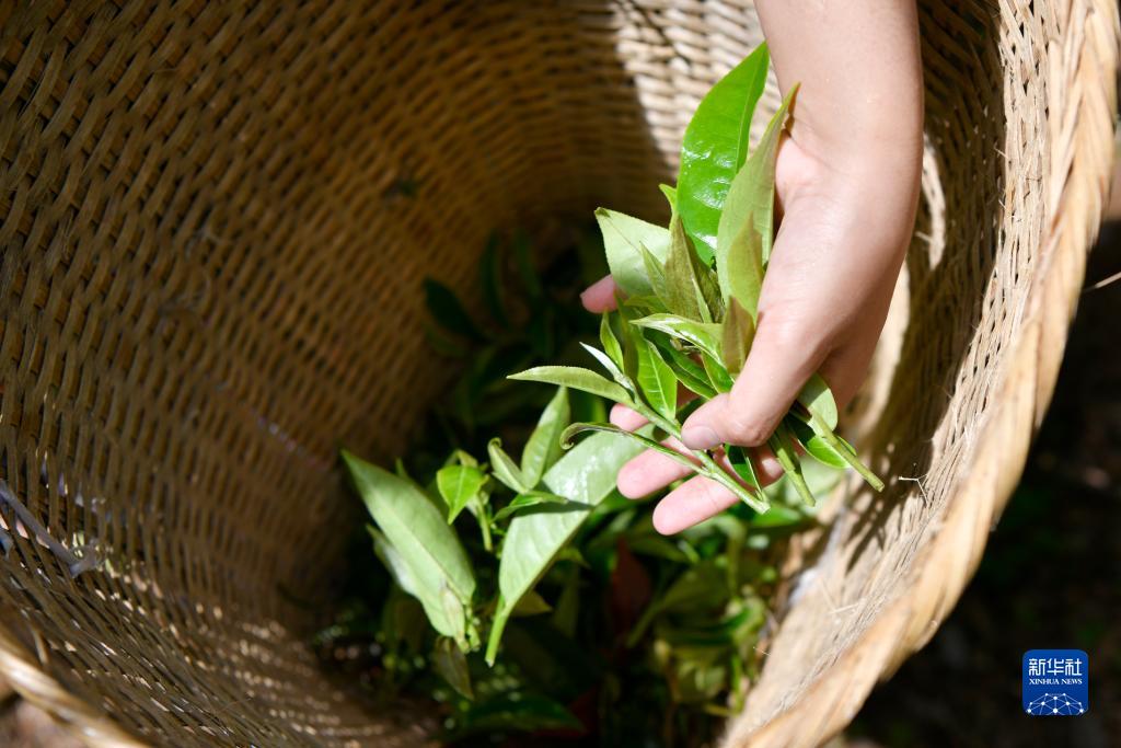 9月19日,景邁山翁基古寨的布朗族茶農玉炳把采摘的秋茶放入竹簍。