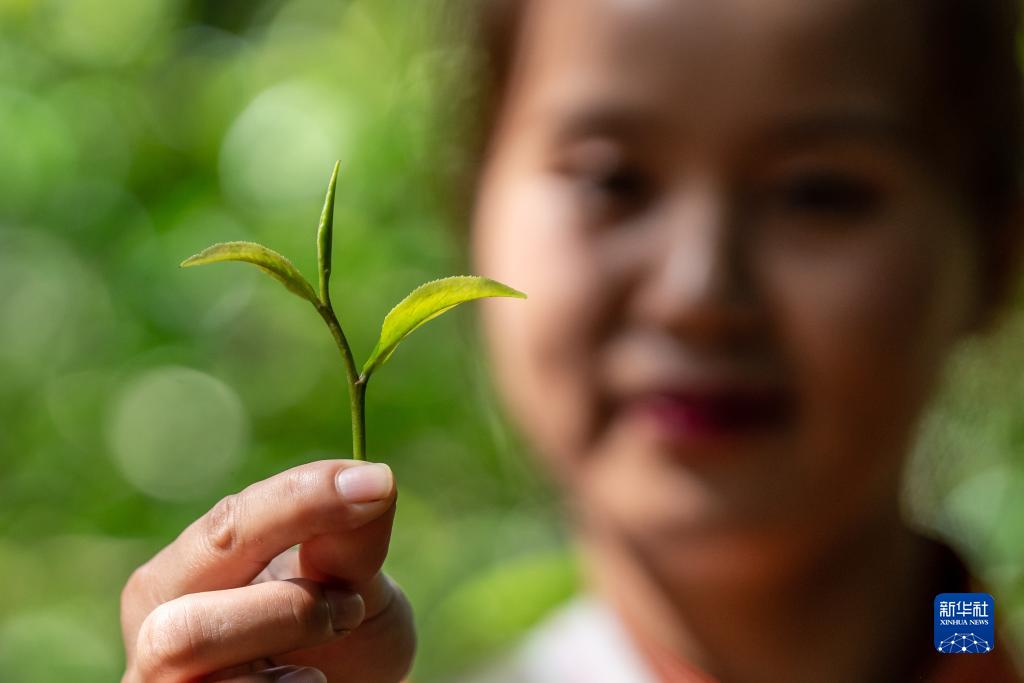 9月19日,景邁山翁基古寨的布朗族茶農小花展示采摘的秋茶。