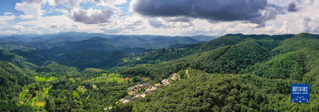 被山林與茶園環繞的景邁山芒景村一景(無人機照片,8月30日攝)。