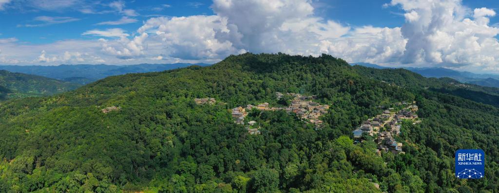 被山林與茶園環繞的景邁山芒景村一景(無人機照片,8月30日攝)。