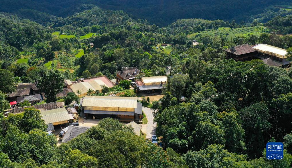 景邁山芒景村許多村民住宅頂層都設置有晾曬茶葉的棚子 (無人機照片,8月30日攝)。