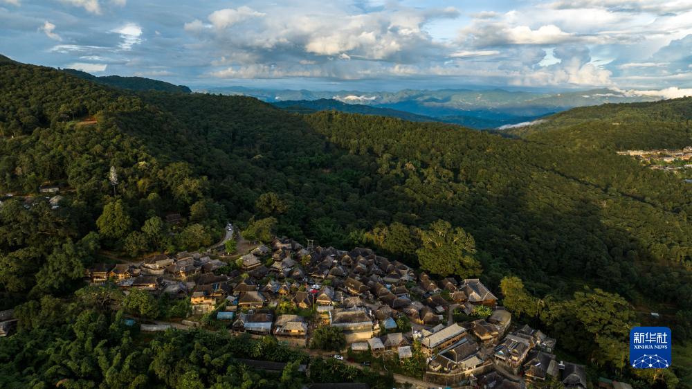 被山林與茶園環繞的景邁山翁基古寨一景(無人機全景照片,9月18日攝)。