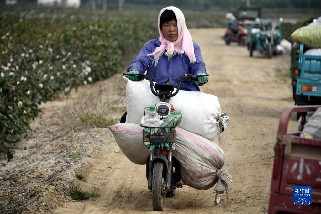 9月19日,山東省無棣縣西小王鎮棉農在運送采收的新棉。