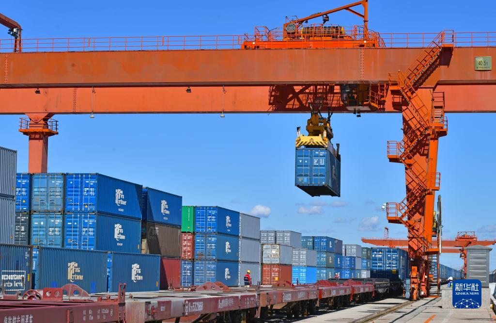 9月19日,在中歐班列(沈陽)集結中心,中國鐵路沈陽局集團有限公司工作人員使用龍門吊進行中歐班列裝車作業。