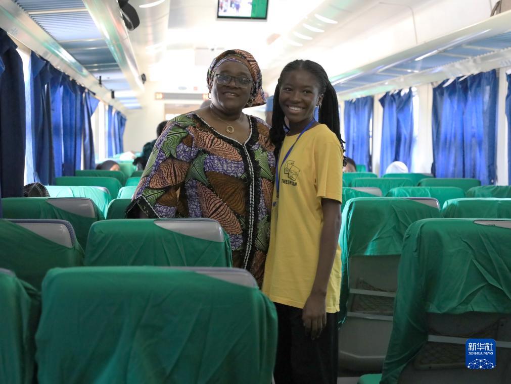 9月18日,在尼日利亞首都阿布賈的阿卡鐵路起點站伊都火車站,兩名乘客在車廂內留影。