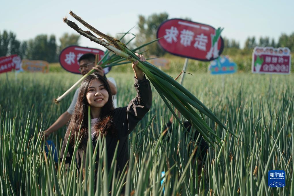 9月20日,在北京市平谷區東高村鎮趙家務村大蔥種植基地,市民在活動現場體驗拔大蔥。