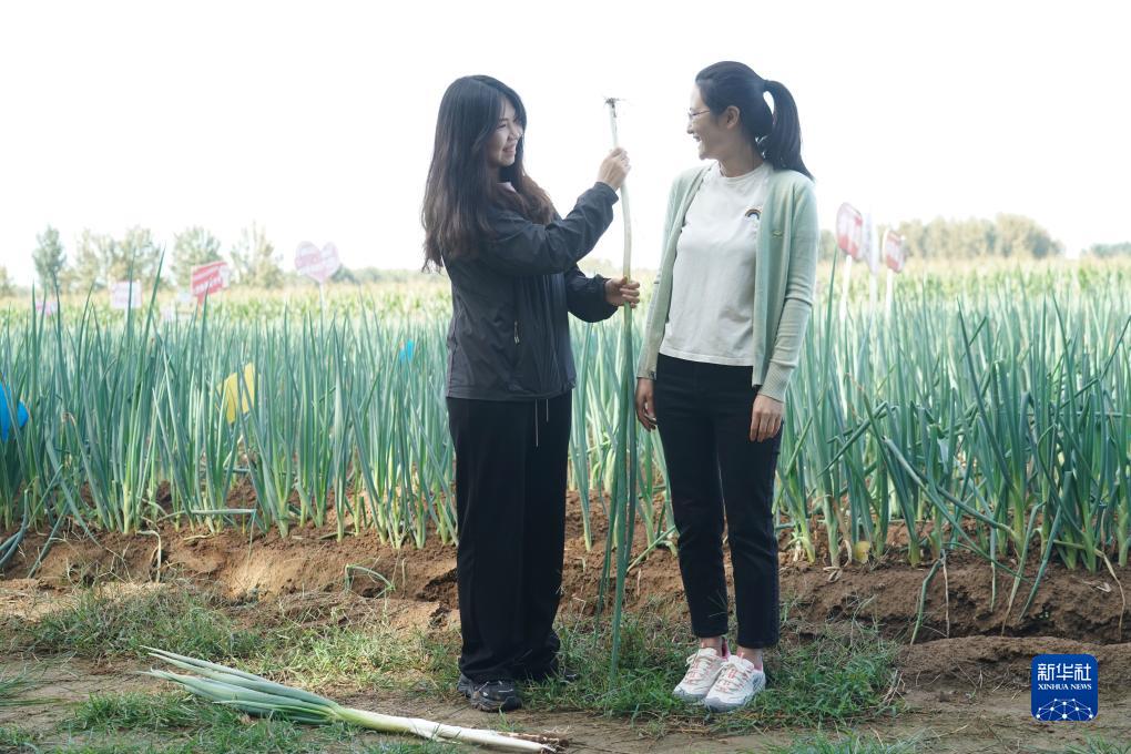 9月20日,在北京市平谷區東高村鎮趙家務村大蔥種植基地,市民與大蔥比高度。