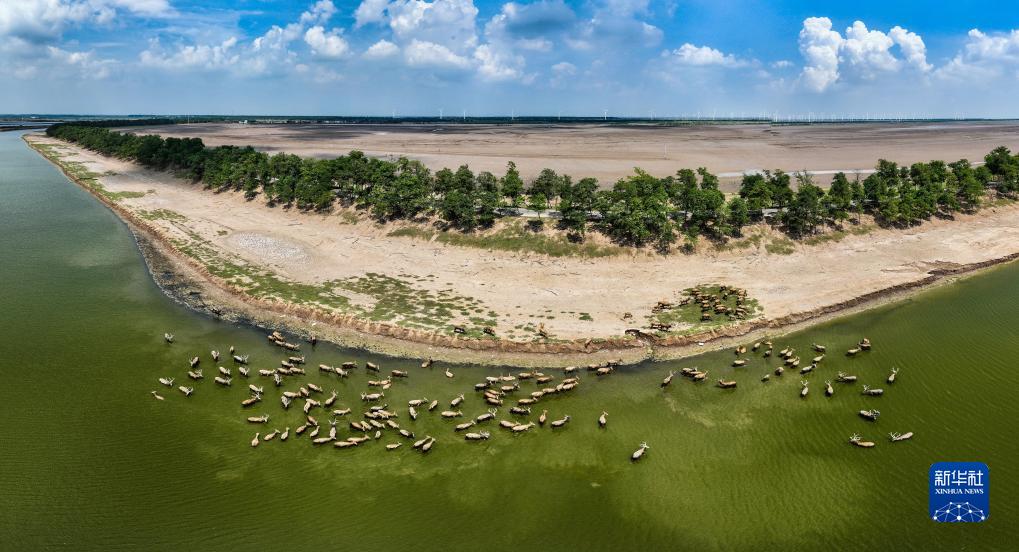 麋鹿生活在江蘇大豐麋鹿國家級自然保護區(8月21日攝,無人機照片)。