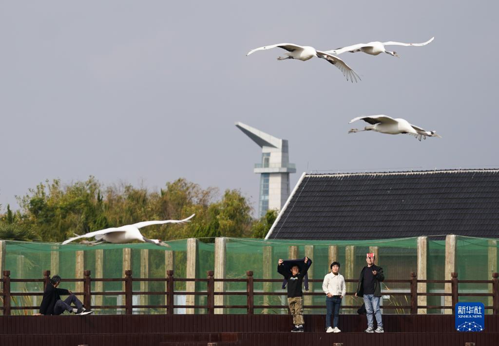 在江蘇鹽城濕地珍禽國家級自然保護區,游客觀看人工繁育的丹頂鶴練習飛翔(2022年11月8日攝)。