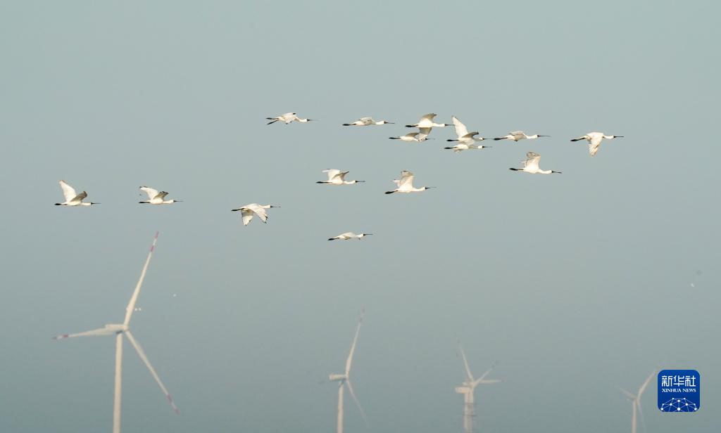 黑臉琵鷺飛行在東臺條子泥濕地上空(9月1日攝)。