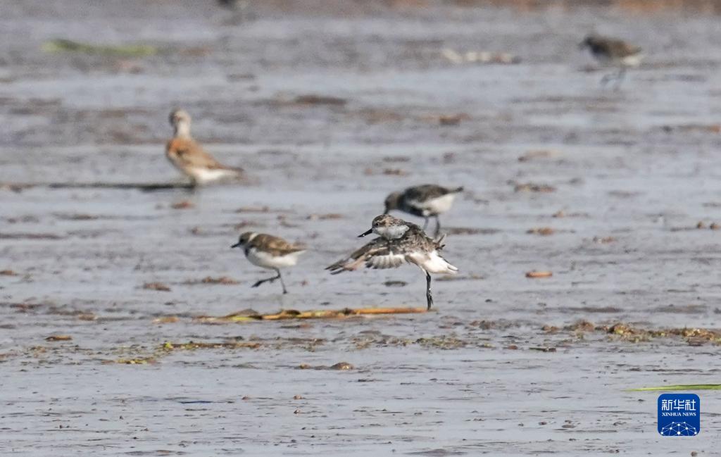 勺嘴鷸(下右)在東臺條子泥濕地里玩耍(9月1日攝)。
