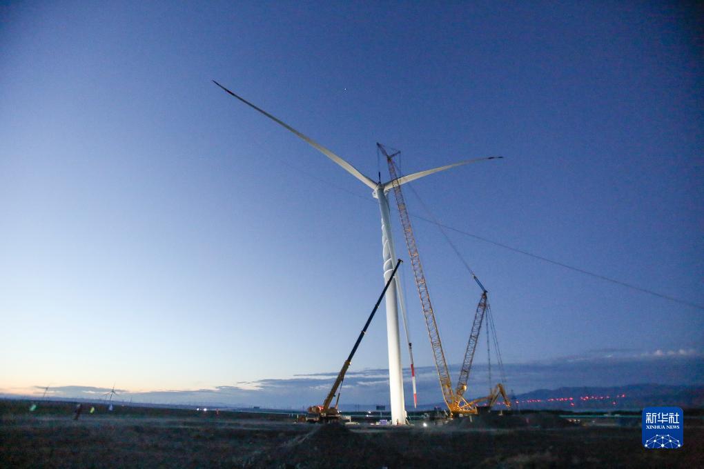 在新疆達坂城風電場拍攝的一臺風力發電機組吊裝作業現場(8月4日攝)。