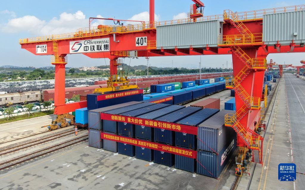 當日,搭載50英尺集裝箱的鐵路多聯快車分別從上海閔行站、廣州國際港站、長沙北站、昆明王家營西站始發,將常態化投入鐵路貨物運輸。據了解,50英尺集裝箱由國鐵集團自主研發,箱體總重36噸,載重30.85噸,容積達114.4立方米,比40英尺國際標準箱容積增加50%,是目前國內容積最大的集裝箱,滿足鐵路貨物列車裝載和運輸安全要求,并經過了上線測試和安全評估。