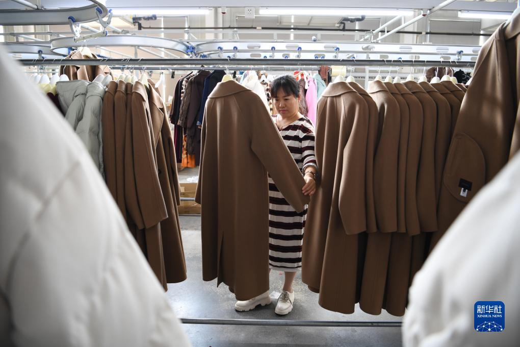 9月20日,在位于南宮市的河北鴻熙服裝股份有限公司,工人在檢查服裝產品質量。