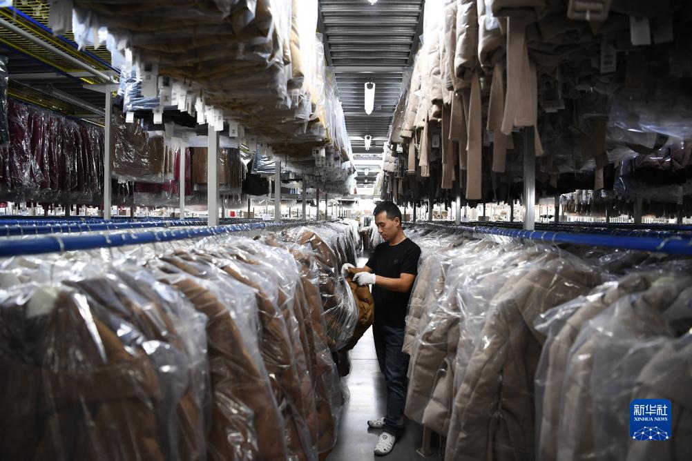 9月20日,在位于南宮市的河北鴻熙服裝股份有限公司,工人在庫房內整理服裝產品。
