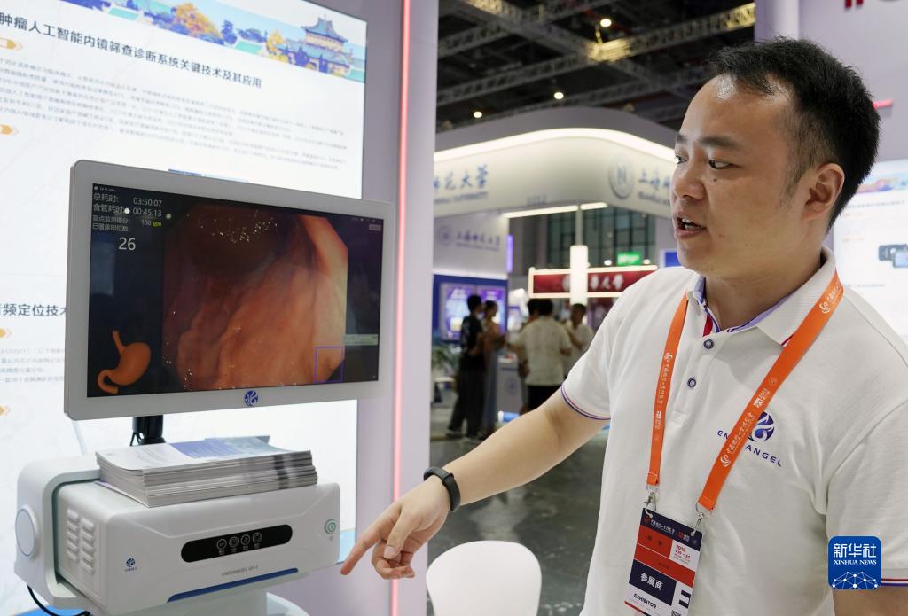 9月20日,武漢大學的展臺工作人員介紹消化道腫瘤人工智能內鏡篩查診斷系統。