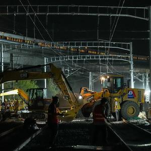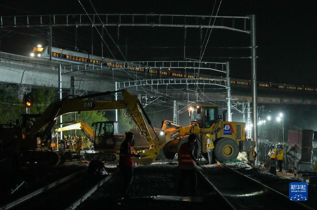 9月19日夜晚,施工人員在滬昆鐵路上海七寶至春申段線路上作業。