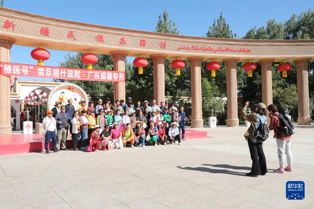 乘坐“穗疏號”廣東援疆專列的廣東游客,在“樂器村”合影留念(8月29日攝)。