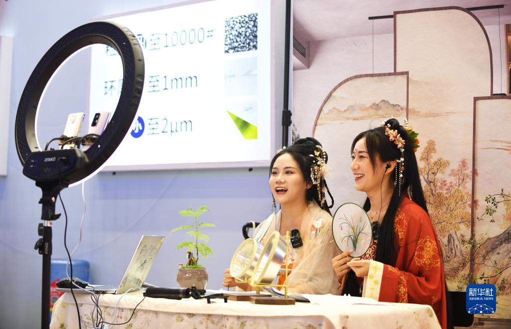9月20日,在鄭州國際會展中心,參展企業工作人員通過手機直播介紹產品。
