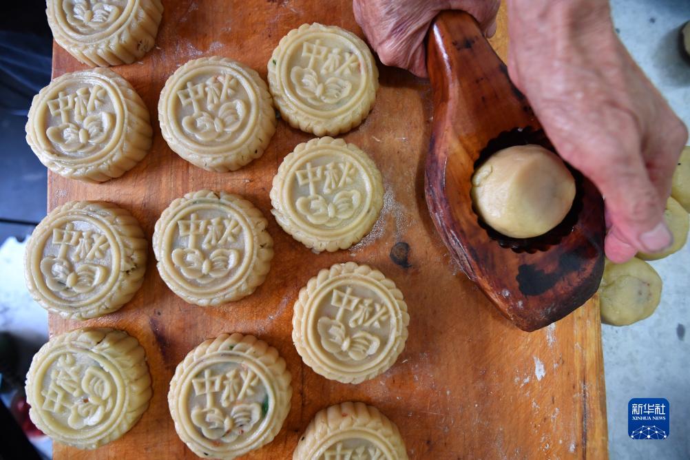9月20日,在河北省石家莊市井陘縣天長鎮的一家手工月餅作坊里,老師傅使用傳統手藝制作月餅。