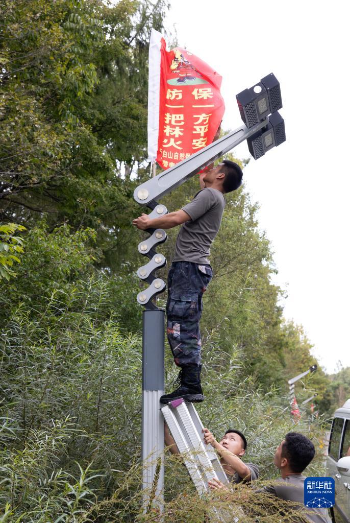 工作人員在長白山國家級自然保護區內懸掛森林防火宣傳旗(9月16日攝)。
