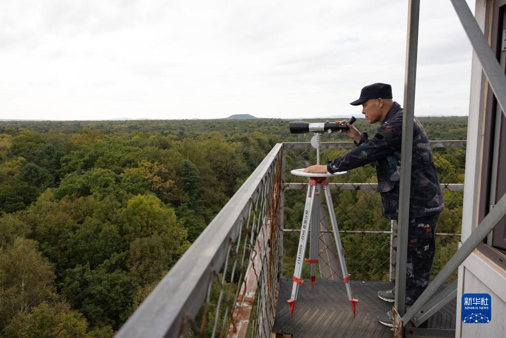長白山國家級自然保護區,瞭望員王孝華正在瞭望臺上值守(9月16日攝)。進入森林防火期后,他天一亮就登上瞭望臺觀測,直至天黑才下臺休息。