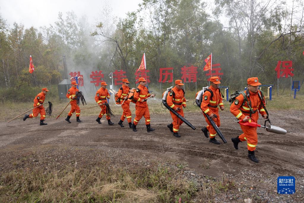 在長白山國家級自然保護區王池保護管理站,風災區專業撲火隊正在開展森林火災應急處置、撲救技戰術、緊急避險等方面的訓練(9月17日攝)。