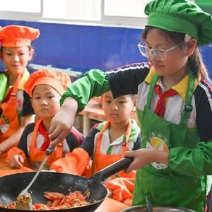 9月20日,重慶市忠縣烏楊小學廚藝社團的學生在學習、體驗炒菜。