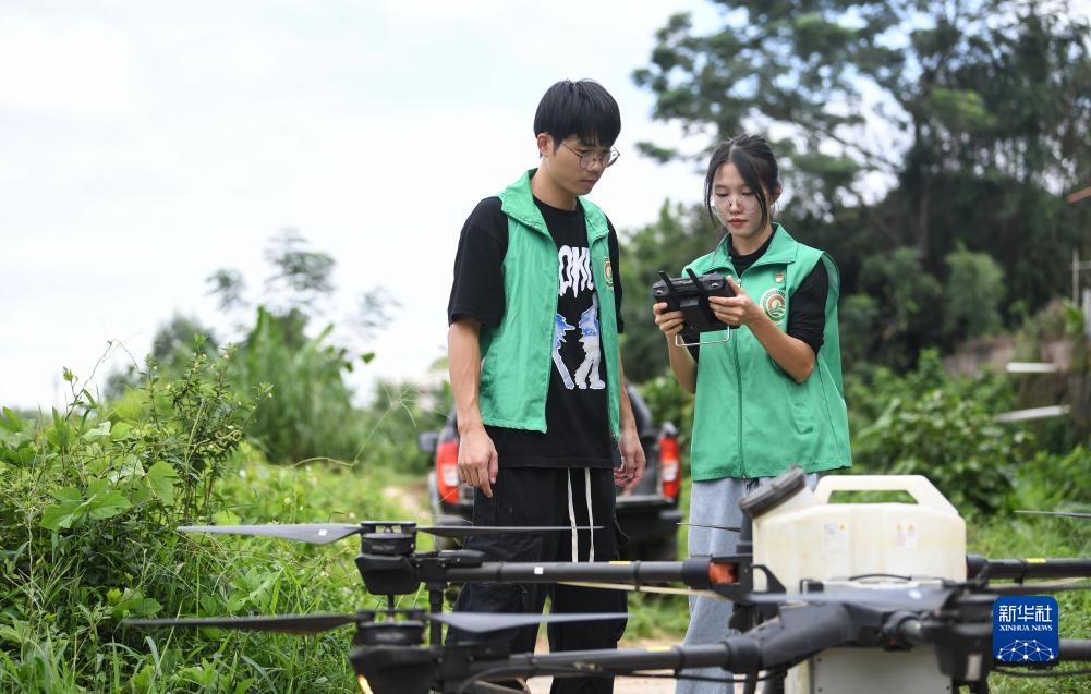 9月13日,位于廣州市增城區石灘鎮石湖村一處機耕路上,沈笑芬(右)給合作社實習生講解農用無人機操作。