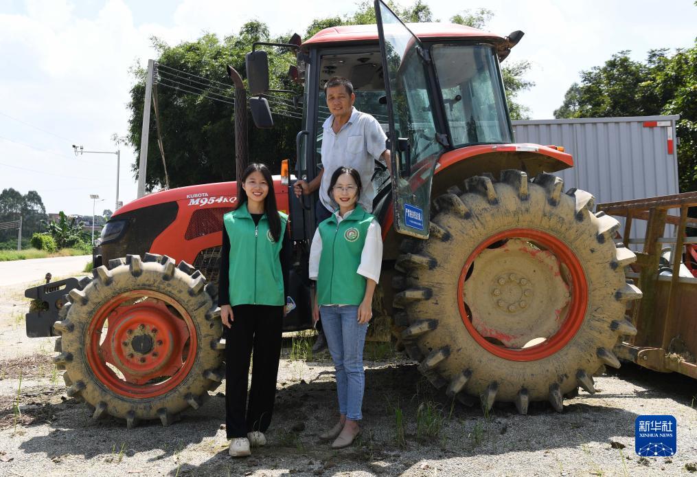 9月18日,在廣州市增城區石灘鎮石湖村石鄉農機專業合作社,沈燕芬(前右)、沈笑芬(前左)和父親沈燦星在農機前留影。