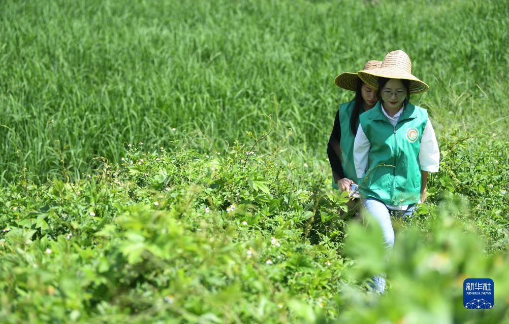 9月18日,在廣州市增城區石灘鎮石湖村一處農田,沈燕芬(前)和沈笑芬查看禾苗長勢。