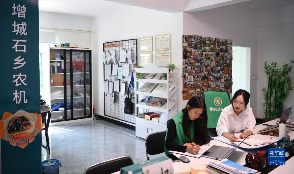 9月18日,在廣州市增城區石灘鎮石湖村的石鄉農機專業合作社,沈燕芬(右)和沈笑芬在商量工作規劃。