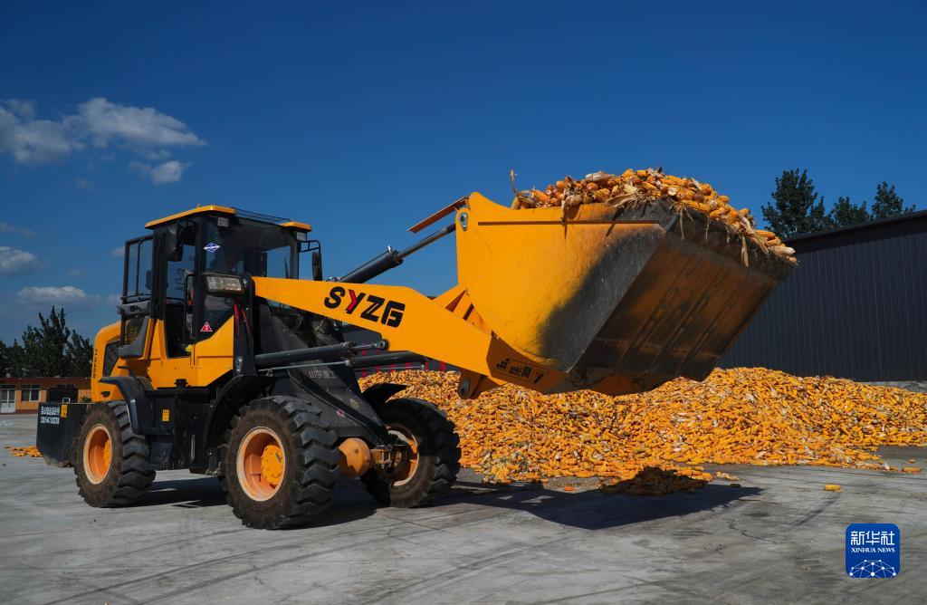 9月20日,在山東省新泰市禹村鎮,農戶利用機械設備搬運、晾曬剛收獲的玉米。