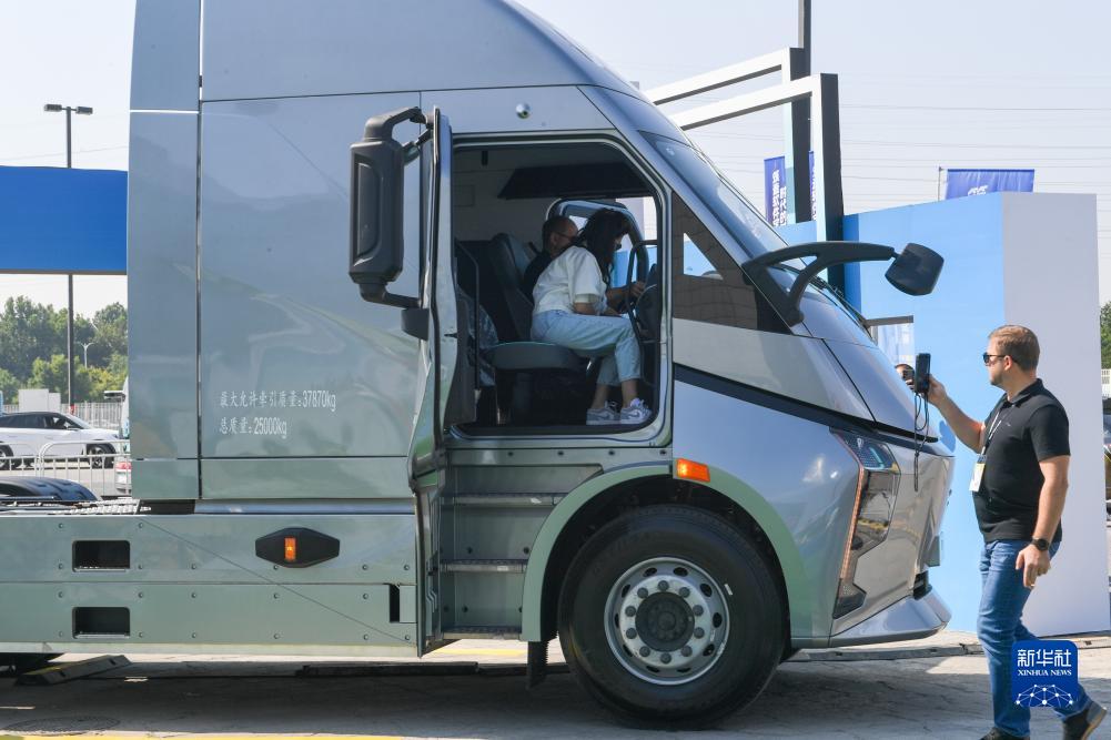 9月21日,在2023世界智能網聯汽車大會室外展區,幾位國外參觀者在參觀一輛新能源重卡。